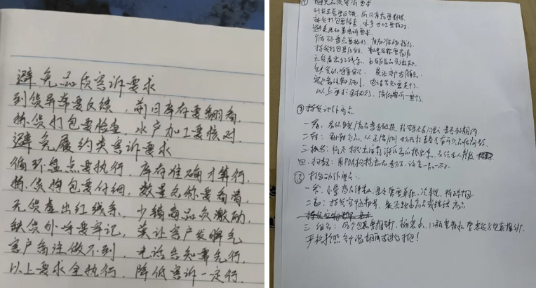 We had a few colleagues who had particularly many customer complaints, which led our supervisor being put into a “penalty box” by the 7Fresh system. The higher-ups demanded they punish these sorters. One punishment method was making employees hand-copy packing regulations, take a photo, and send it to the supervisor. Actually, when this happened, I found it quite unbelievable. We were being manipulated like elementary school students, completely without dignity. But the reality was, everyone copied them. Probably for the sorters, as long as they weren’t fined money, this method was acceptable. But it had quite an impact on me personally. After this incident, I realized that in our society, in our workplaces or areas where we work, capital’s control over us is actually the strictest. We sorters, during our workdays, daily have no dignity.