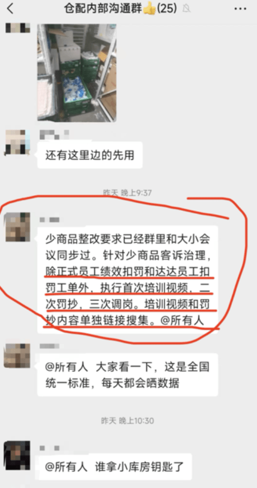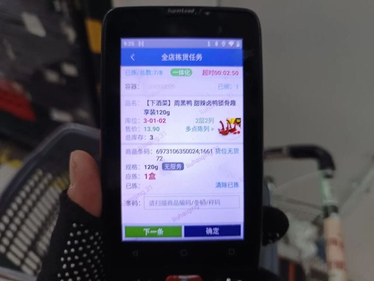 He Siqi: The complaints I mentioned earlier that led to the hand-copying punishment – how did those happen? For example, an order has 6 items. We need to scan the barcodes of all 6 items with the PDA to complete the order. If I couldn’t find one item, initially my method was to keep looking, but by the time I found it, the order was already overdue. Later, I learned a way to avoid being late: “code bypassing”. Every product has a code displayed on the PDA. When I couldn’t find an item, other sorters would tell me to “bypass the code” first – meaning directly input the numerical code without scanning. The system would then consider the order complete. However, when my colleague later found the item, I, while packing, could easily have forgotten that this order was originally missing something. At that point, the customer could easily file a complaint. To avoid a complaint, I needed to place a “replenishment order” myself on the 7Fresh app. For instance, I’d order a bottle of water myself (I’d keep the water), and have the rider deliver the missing item to the customer. Although I ended up with the water, the delivery fee ultimately came out of my pocket – another day of “paying to work.”